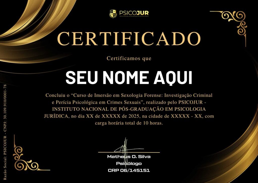 Após a Imersão você receberá um certificado de conclusão atestando a sua conclusão no Curso de Imersão em Sexologia Forense: Investigação Criminal e Perícia Psicológica em Crimes Sexuais.